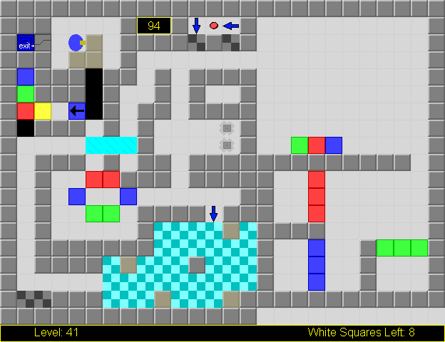 A puzzle game where you have to combine red, blue and green squares together to form the required number of white squares in order to exit the level. Also includes many other level features such as spikes, pits, ice, one way streets, fake walls, and more.