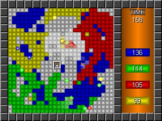 While clicking on the random games button of the Monster Archive in my bored state, I stumbled across this old game. I had downloaded it years ago and thought it very good, but to my shock and horror I found that Crazy Painters was reviewless! (le gasp!) So guess what I decided to do.This is yet another Game Maker arcade game that I think came out successful. This game is for one to four players, or you can set all the players to the “computer” setting and watch your PC play itself.