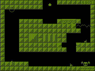 It's pretty simple. The game consists of a circular course of one-screen levels which generally require precise navigation and minor object manipulation (mostly in the form of defecating on unsuspecting switches [see image]). It's a simple formula, and mostly effective. However, this game has few level elements - bullets, walls, falling spikes, switch-controlled electricity - and it wrings them for basically all they're worth. In fact, after a while I started to wonder if I had accidentally backtracked, simply because some of the levels are nearly identical. Fortunately, the game doesn't quite outstay its welcome - I completed the circuit in 15 harrowing minutes and 12 seconds. Unfortunately, though, the rewards are sort of nonexistant. [Aside: the game documentation doesn't explain that you actually have to hold the up key to fly rather than just pressing it over and over like in other games of this type. Once I realized this the game became a lot easier.]