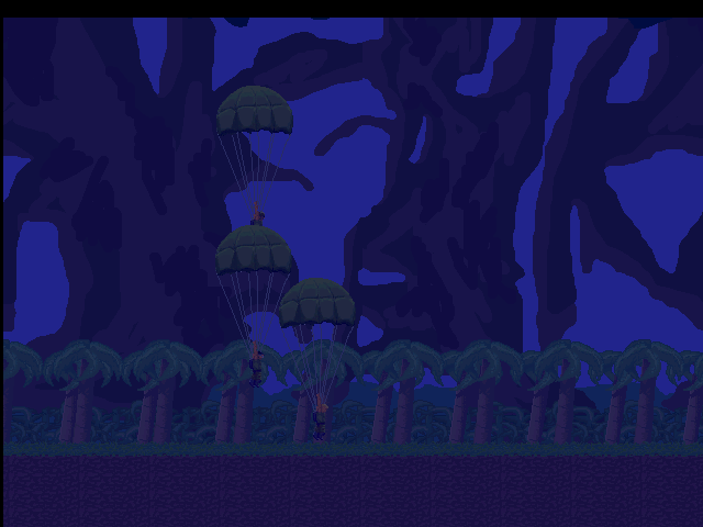 The game starts off with a brief cutscene of men in a helicopter flying over the remote jungle of some unspecified location. After a small chat regarding the intelligence on the operation and the suspected terrorists whom the men are after, the three heroes of the game make a terrific leap off the craft and parachute down to Earth. This is when you take control.