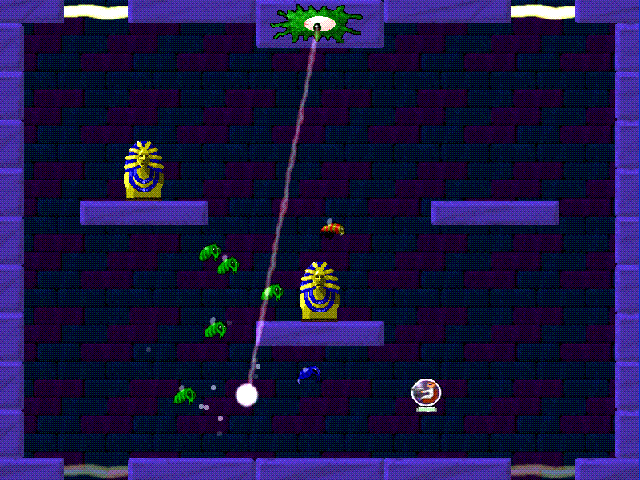 In The Pyramid, you play as an adventurer armed with a laser gun and encased in a protective bubble. You must guide him through a wide variety of monster-infested rooms in order to find the treasure hidden in the depths of an ancient pyramid. Within each room, your goal is to blast away at the assorted monsters until the pyramid's guardian grants you a crystal, which can in turn be used to open a barrier and move on to the next room. In concept it's extremely simple, but I guess the beauty of this and games like it is that it manages to be a lot of fun anyway. It's pure arcadey action, and it's almost disturbing how much time you can spend playing it. The coding is practically flawless; I've not run into a single error that I can think of in the hours I've spent playing this game. There is a total of 140 different rooms and just as many monsters, and even without dying it'll take you plenty of runs to find them all. This adds an element of discovery and replayability that I think all games ought to have. There are several different control setups and a myriad of customizable options besides this, so there's really very little to complain about in terms of variety. Also, there's an online highscore table, which is always an improvement.